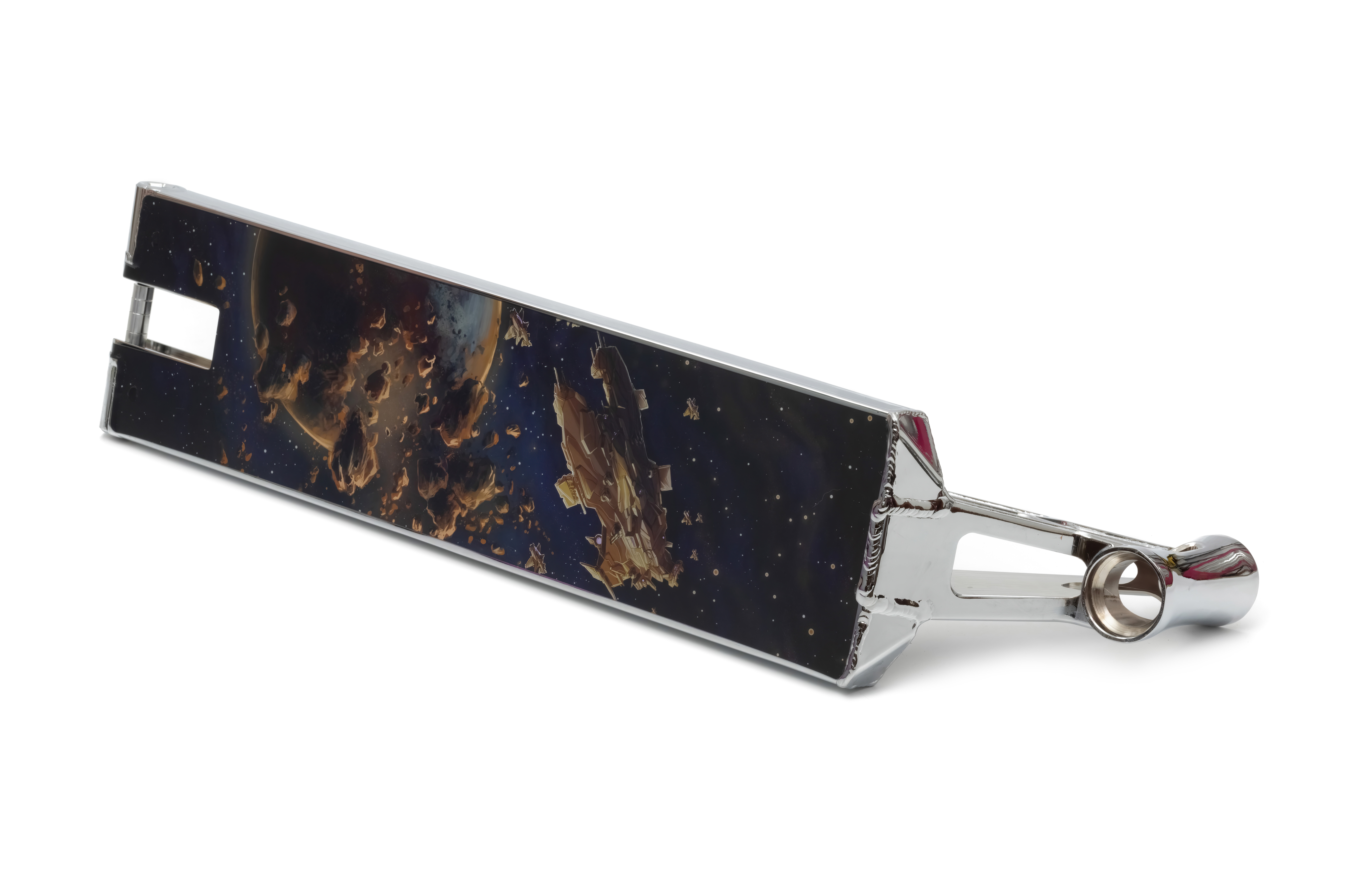 Эта стритовая дека имеет единый рулевой стакан и шею, вваренные декэнды, абсолютно плоское дно, ось 8 мм с поддержкой колес до 120х30 мм, и просто космический дизайн.